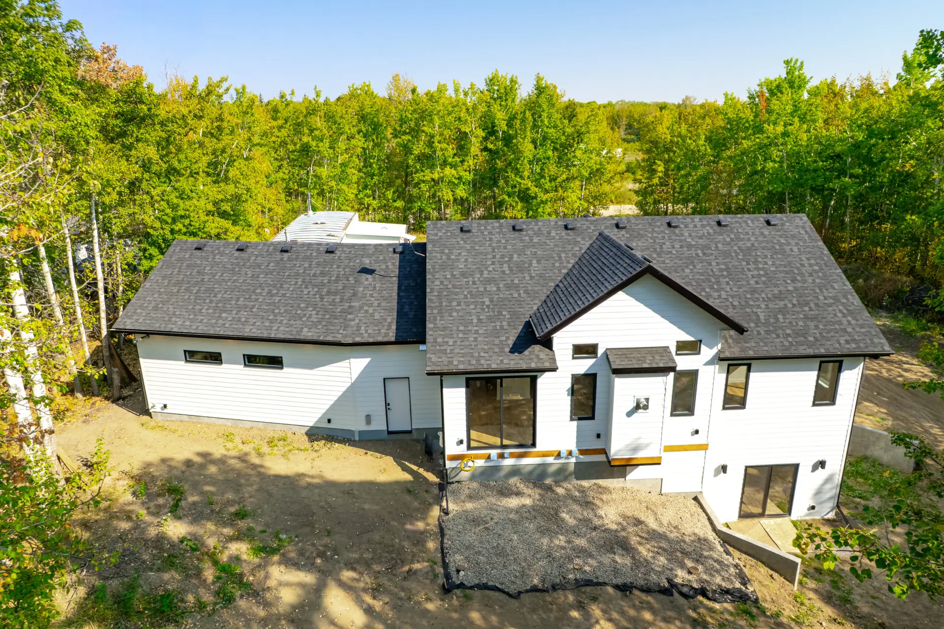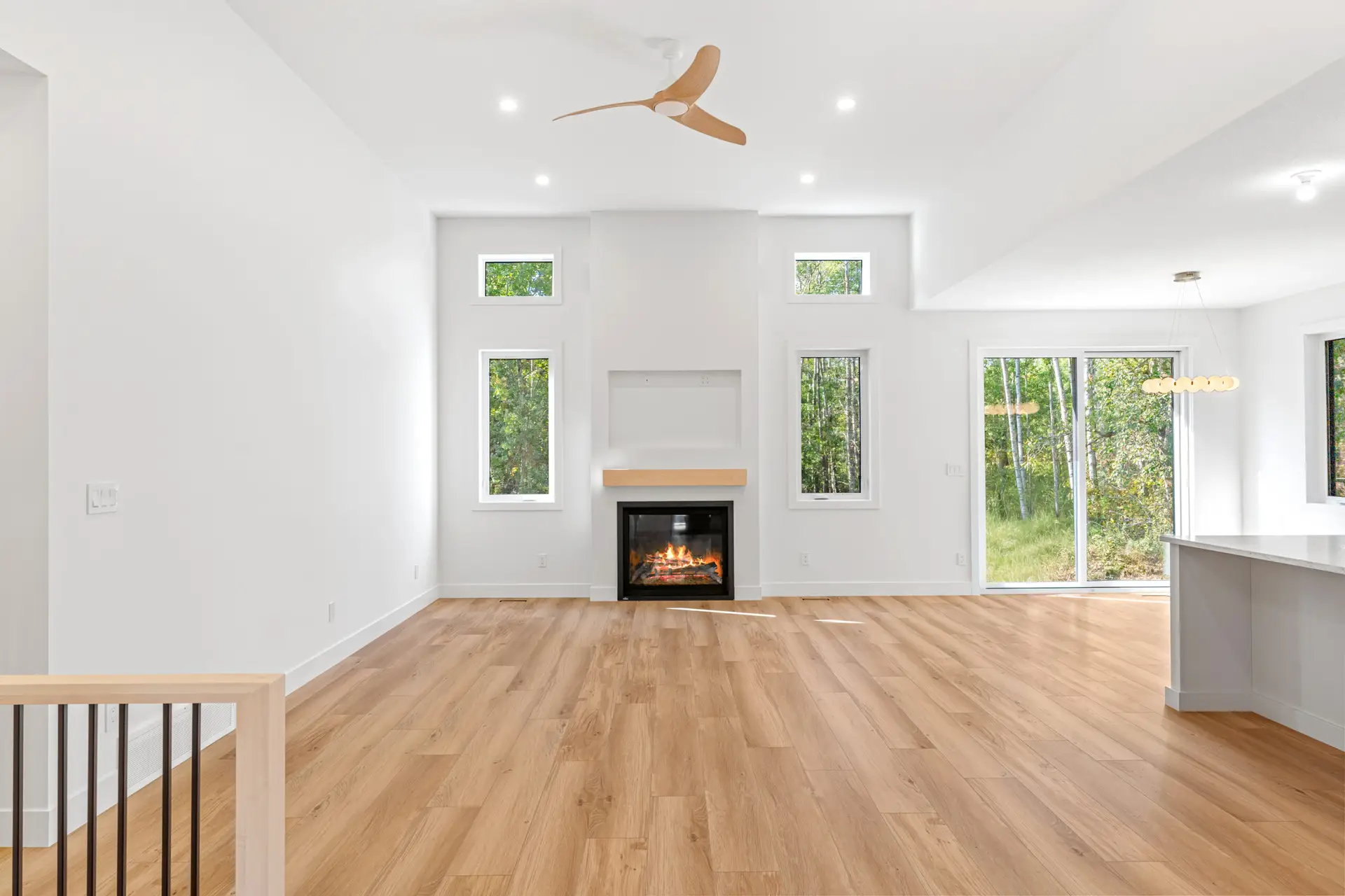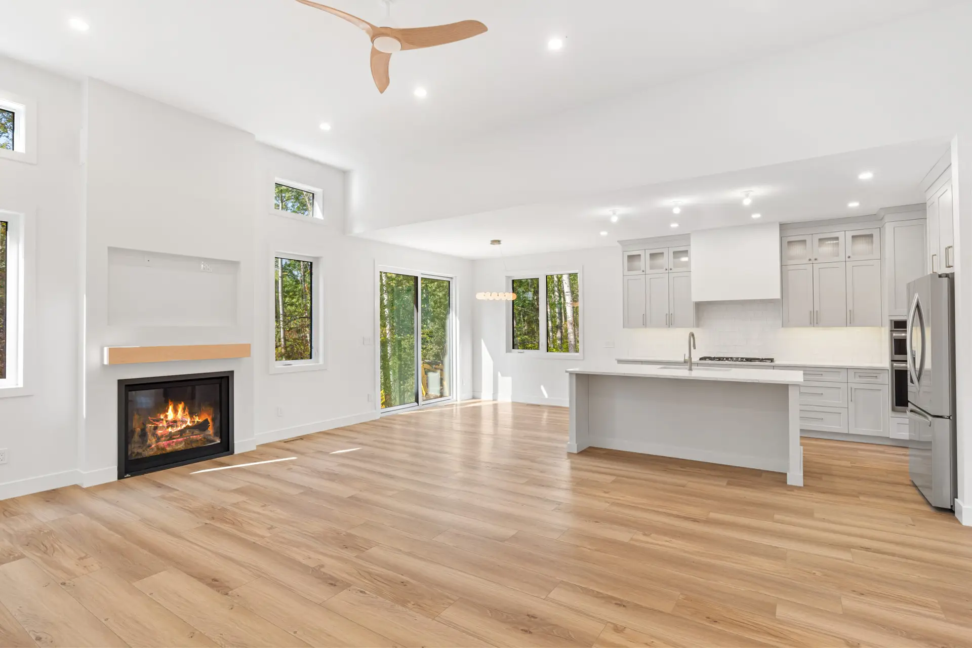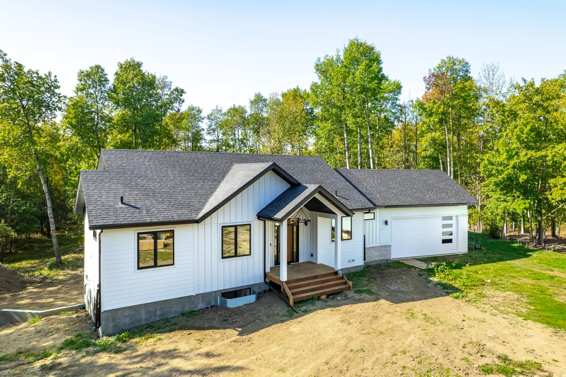 This beautifully crafted modern home blends clean design with warm, natural touches, offering both style and comfort in a peaceful wooded setting. The bright, open-concept living space features soaring ceilings, wide-plank hardwood floors, and oversized windows that fill the home with natural light. A sleek gas fireplace anchors the living area, while the designer kitchen impresses with custom cabinetry, quartz countertops, premium appliances, and a spacious island perfect for gathering. Outside, the crisp white exterior with black accents and an attached garage creates striking curb appeal, all surrounded by mature trees that provide privacy and tranquility. Thoughtfully designed and move-in ready, this home offers modern living at its finest.