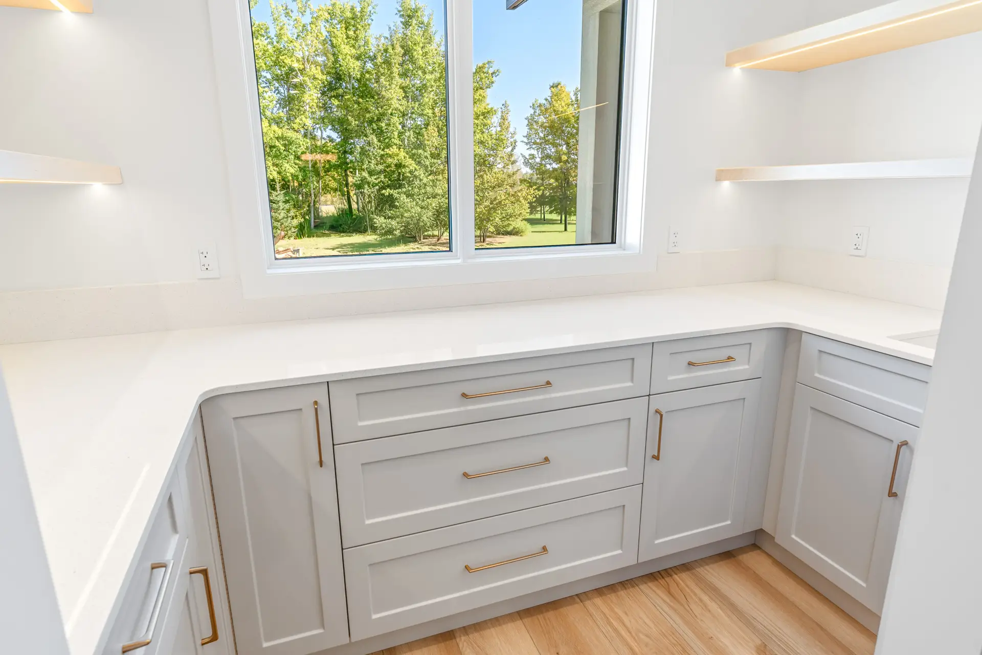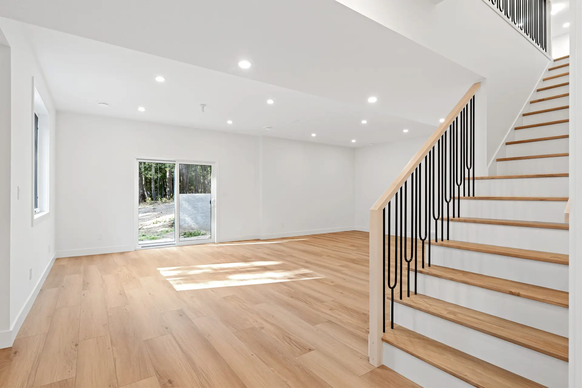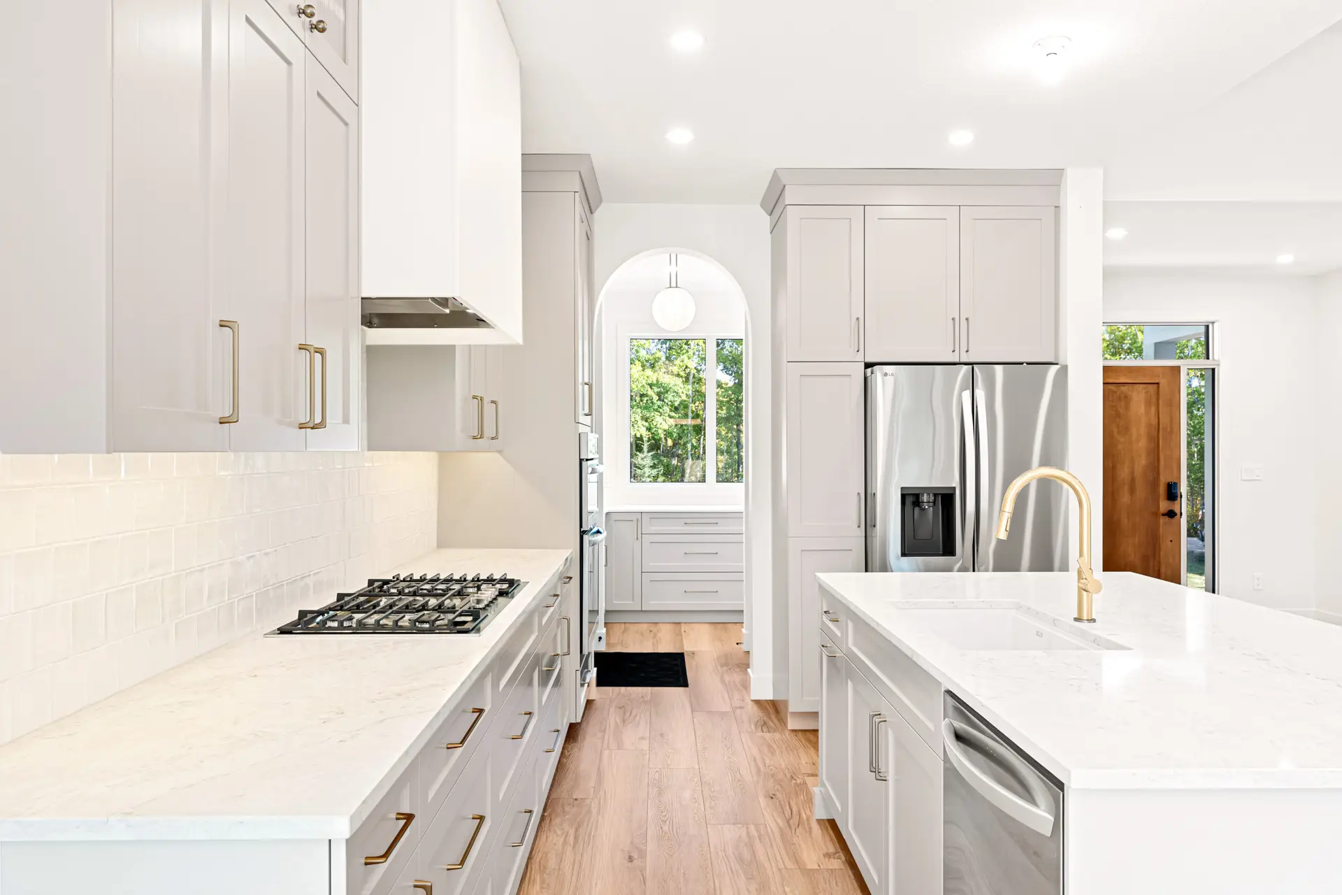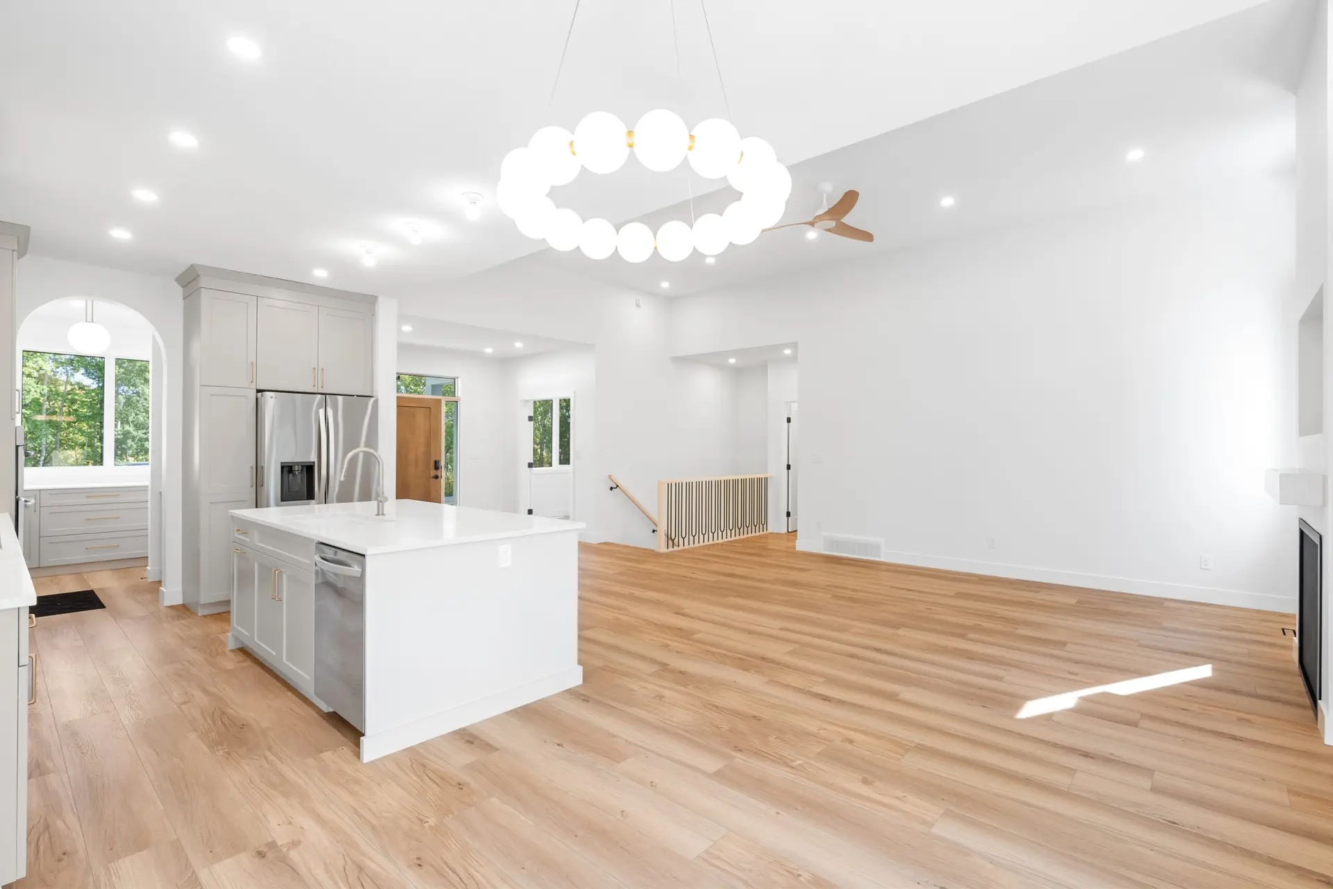 This beautifully crafted modern home blends clean design with warm, natural touches, offering both style and comfort in a peaceful wooded setting. The bright, open-concept living space features soaring ceilings, wide-plank hardwood floors, and oversized windows that fill the home with natural light. A sleek gas fireplace anchors the living area, while the designer kitchen impresses with custom cabinetry, quartz countertops, premium appliances, and a spacious island perfect for gathering. Outside, the crisp white exterior with black accents and an attached garage creates striking curb appeal, all surrounded by mature trees that provide privacy and tranquility. Thoughtfully designed and move-in ready, this home offers modern living at its finest.